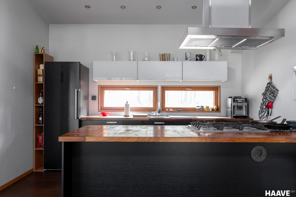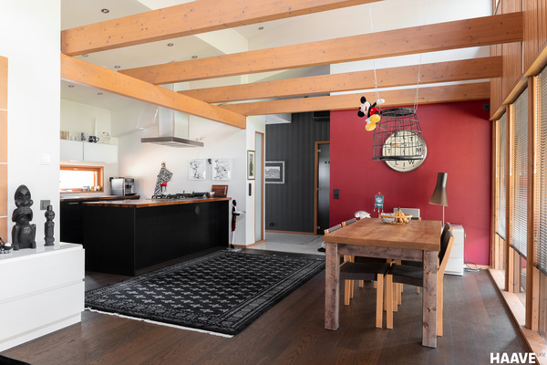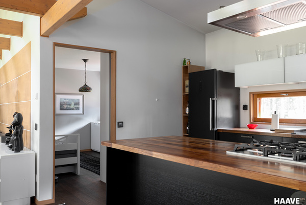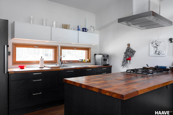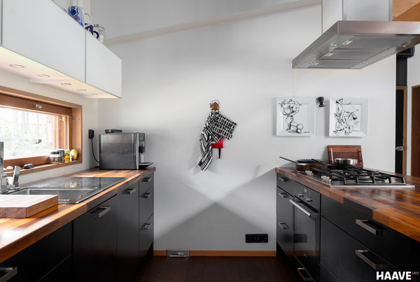 - Keittiön kuvaus: Lattiat tammiparketti, työtasot tammilankku.