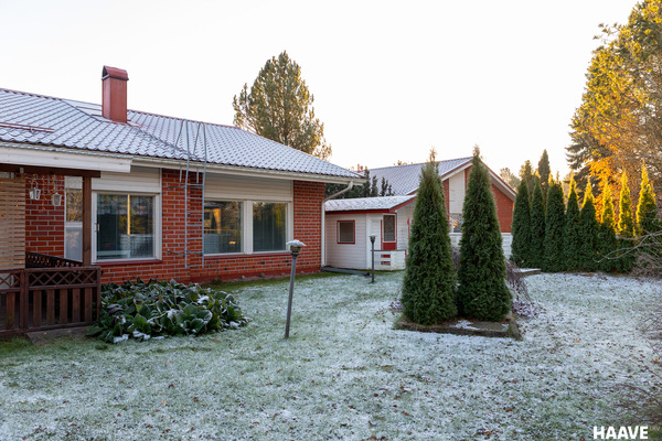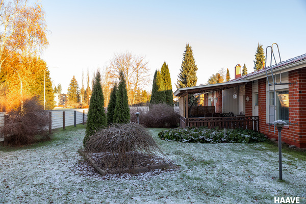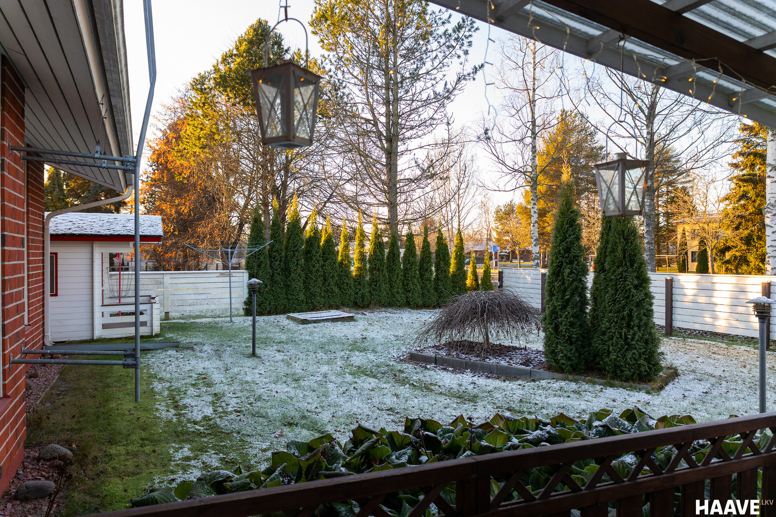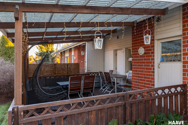 Tilava terassi uusitulla valokatolla tarjoaa ihanteelliset puitteet kesäpäiville, ja pihamaalla on tilaa lasten leikeille – leikkimökki kuuluu kauppaan. Autotalli tekee arjen sujuvaksi.