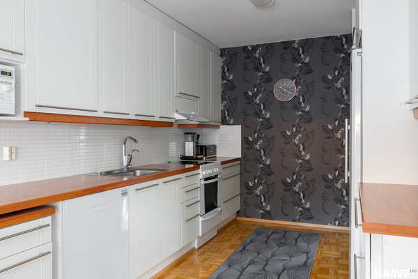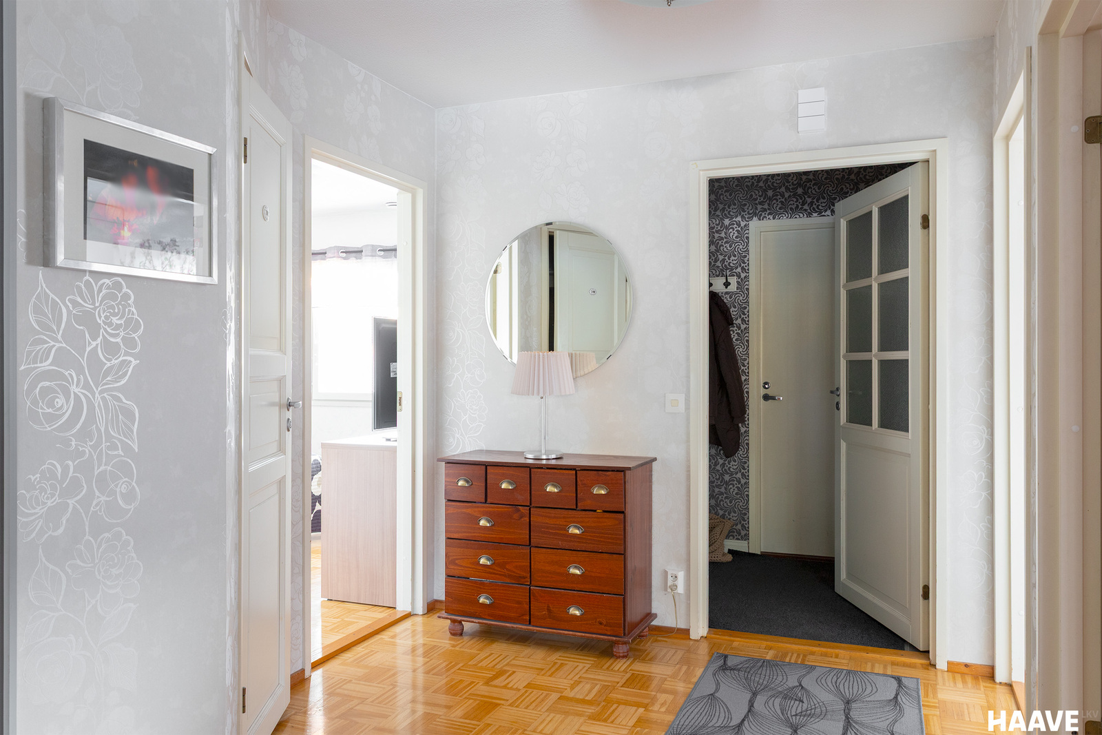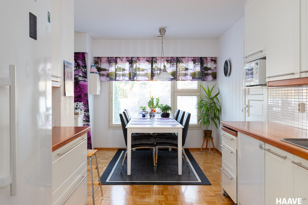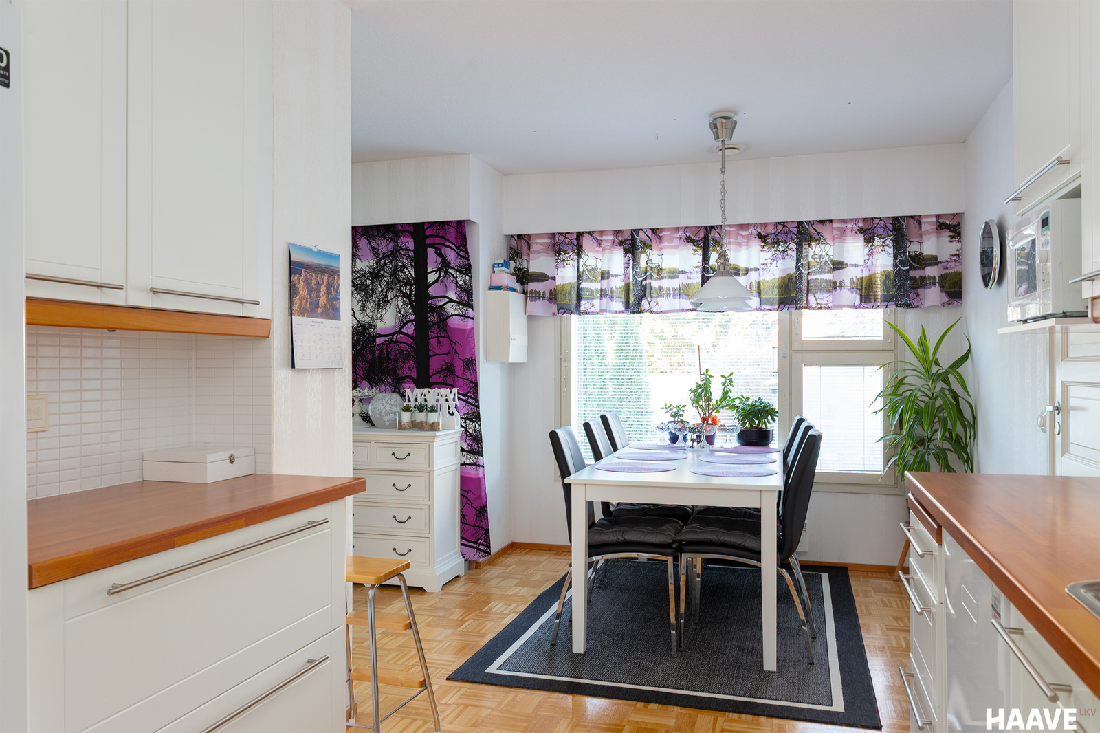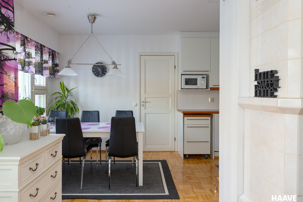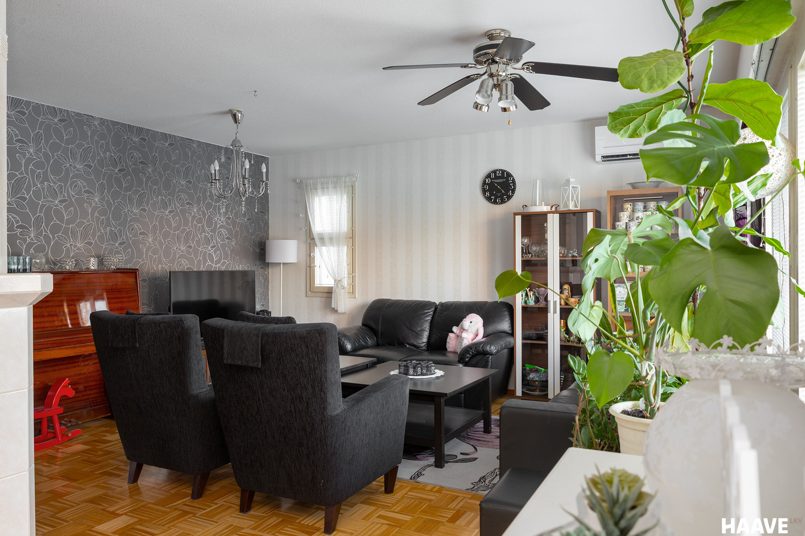 Avarassa neljän huoneen kodissa yhdistyvät valoisuus, selkeät tilaratkaisut ja kodikkaan lämmin tunnelma. Olohuoneen parkettilattia, kauniit tapetit ja varaava takka luovat harmonisen kokonaisuuden, joka toimii sekä arjessa että juhlahetkissä. Keittiöstä löytyy runsaasti kaappi- ja laskutilaa sekä päivitettyjä kodinkoneita—astianpesukone vuodelta 2023 ja tyylikkäät keittiön kaapinovet uusittu aiemmin.