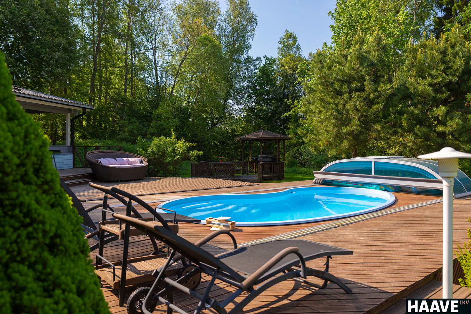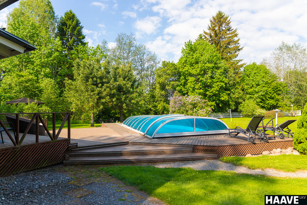 Vuonna 2004 valmistunut pihan saunarakennus puolestaan on täydellinen paikka rentoutua kiireisen päivän jälkeen saunoen ja uiden, koska saunarakennuksen tilavaan terassialueeseen on upotettu iso uima-allas, jota voi käyttää ympäri vuoden. Uima-allasta onkin nykyisellään pidetty ympäri vuoden uintilämpöisenä. Uima-altaan katteen voi avata joko kokonaan tai osittain uinnin ajaksi. Edellä mainittujen lisäksi saunarakennuksessa on keittiöpiste, jossa on jääkaappi, sähkölevyt ja vesipiste/lavuaari. Saunatuvasta löytyy myös varaava takka sekä puukiuas perinteisempään saunomiseen sekä kiireisimpiä varten hetivalmis sähkökiuas.