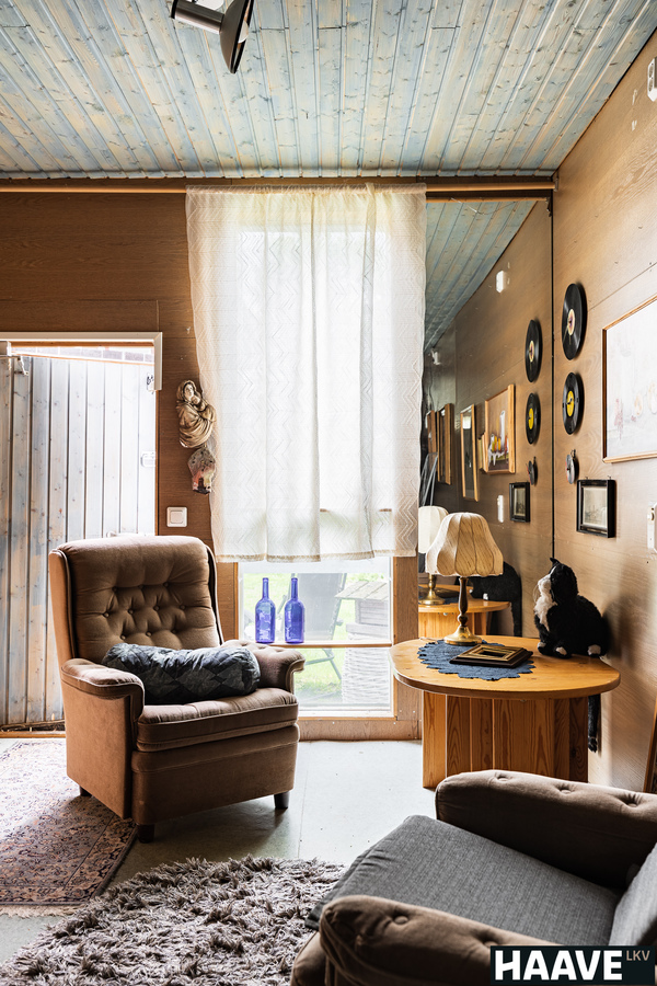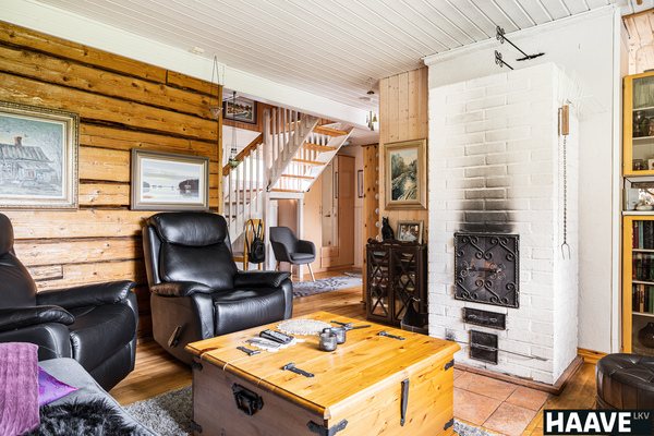 Talon olohuoneessa hirsiseinä huokuu vanhan talon lämpöä ja historiaa ja varaava takka lämmittää kotia.