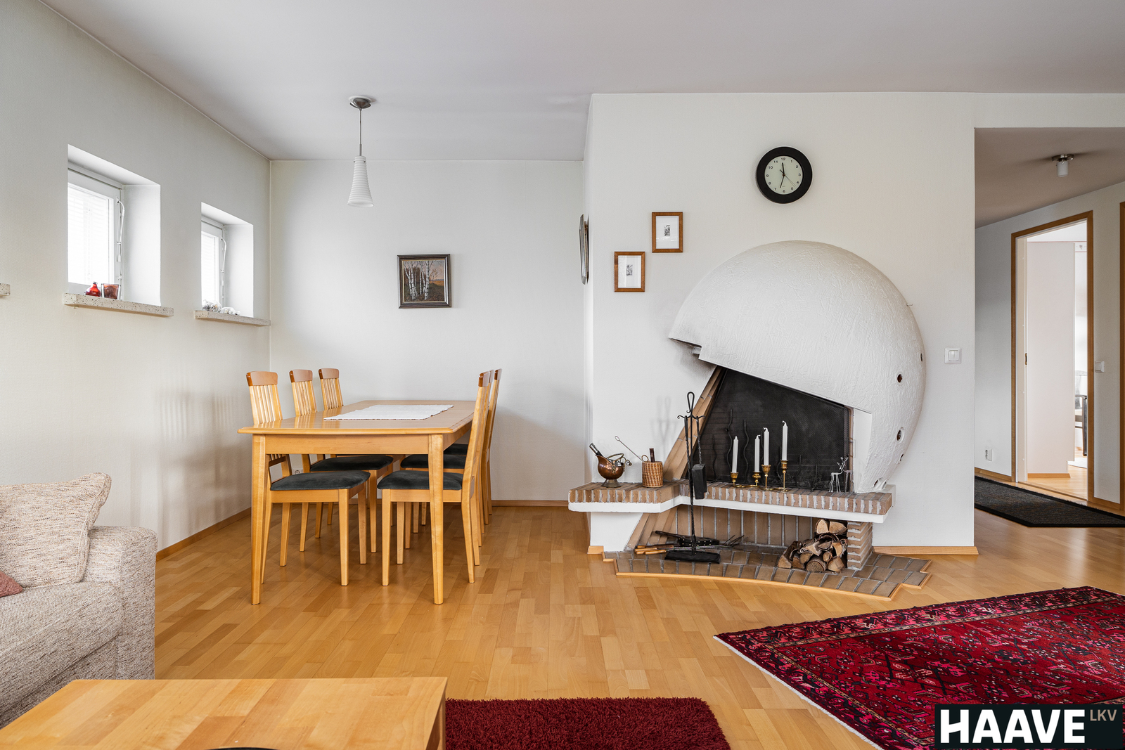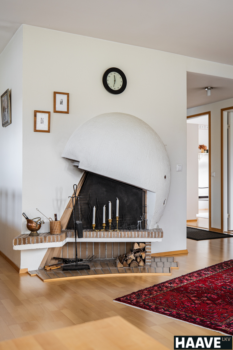 Olohuone on ehdottomasti kodin sydän: suuret ikkunat tuovat runsaasti luonnonvaloa ja tilan katseenvangitsijana toimii kaunis valkoinen avotakka, joka luo kotiin persoonallista ja lämmintä tunnelmaa.