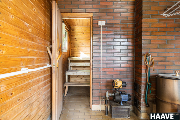 Erillisessä saunarakennuksessa on oma tupa/pukuhuone mihin voi myös asentaa oman takan. Vesi tulee pumpulla omasta kaivosta. Saunomisen jälkeen voit pulahtaa järvessä minkä ranta on ruopattu ja kävelyterassit tehty rannalle asti lisäämään mukavuutta.