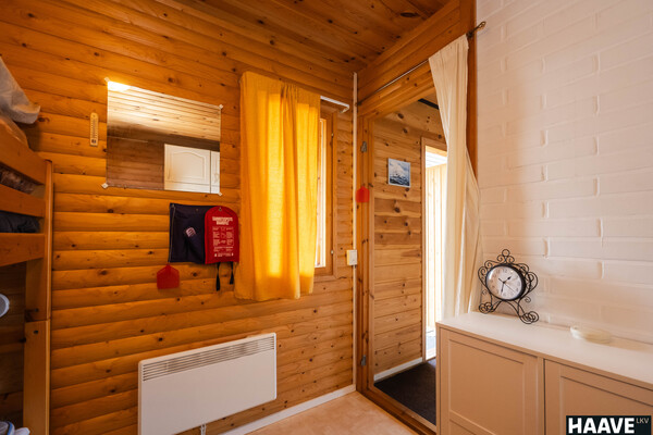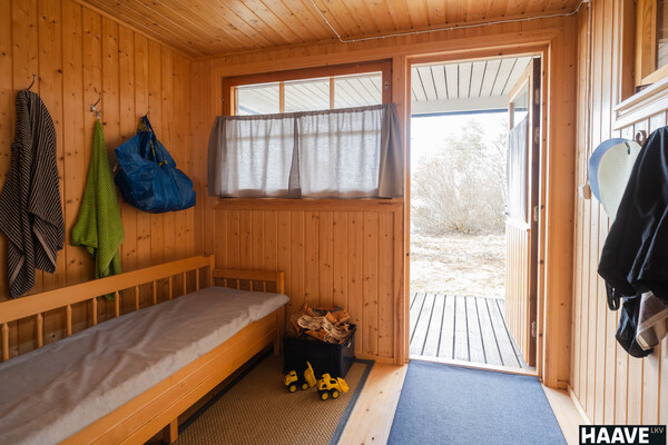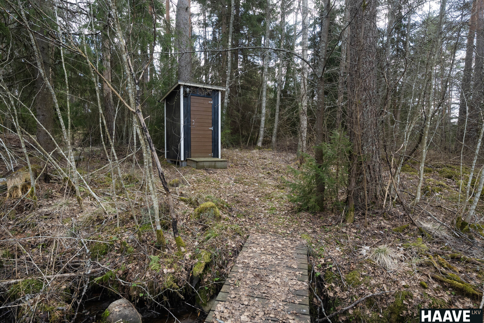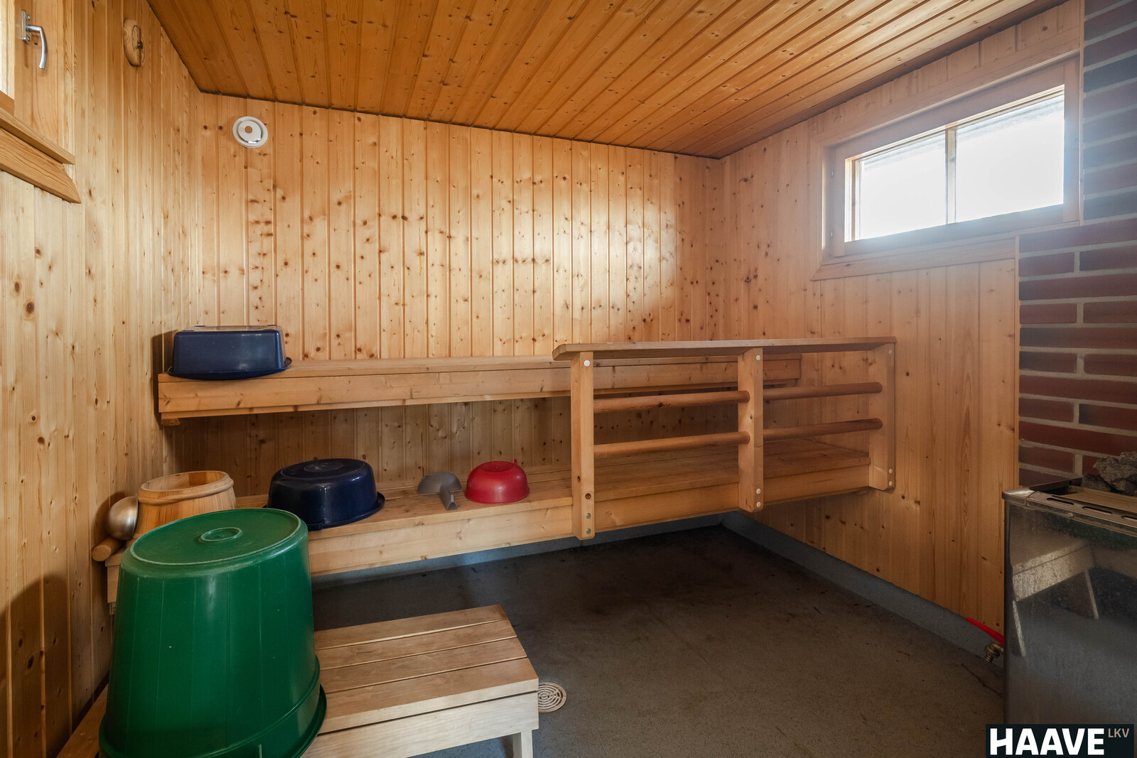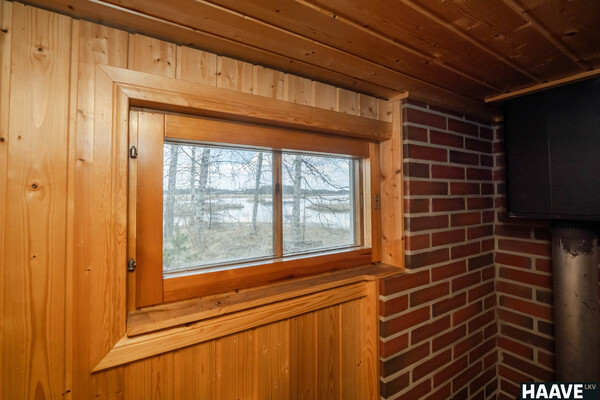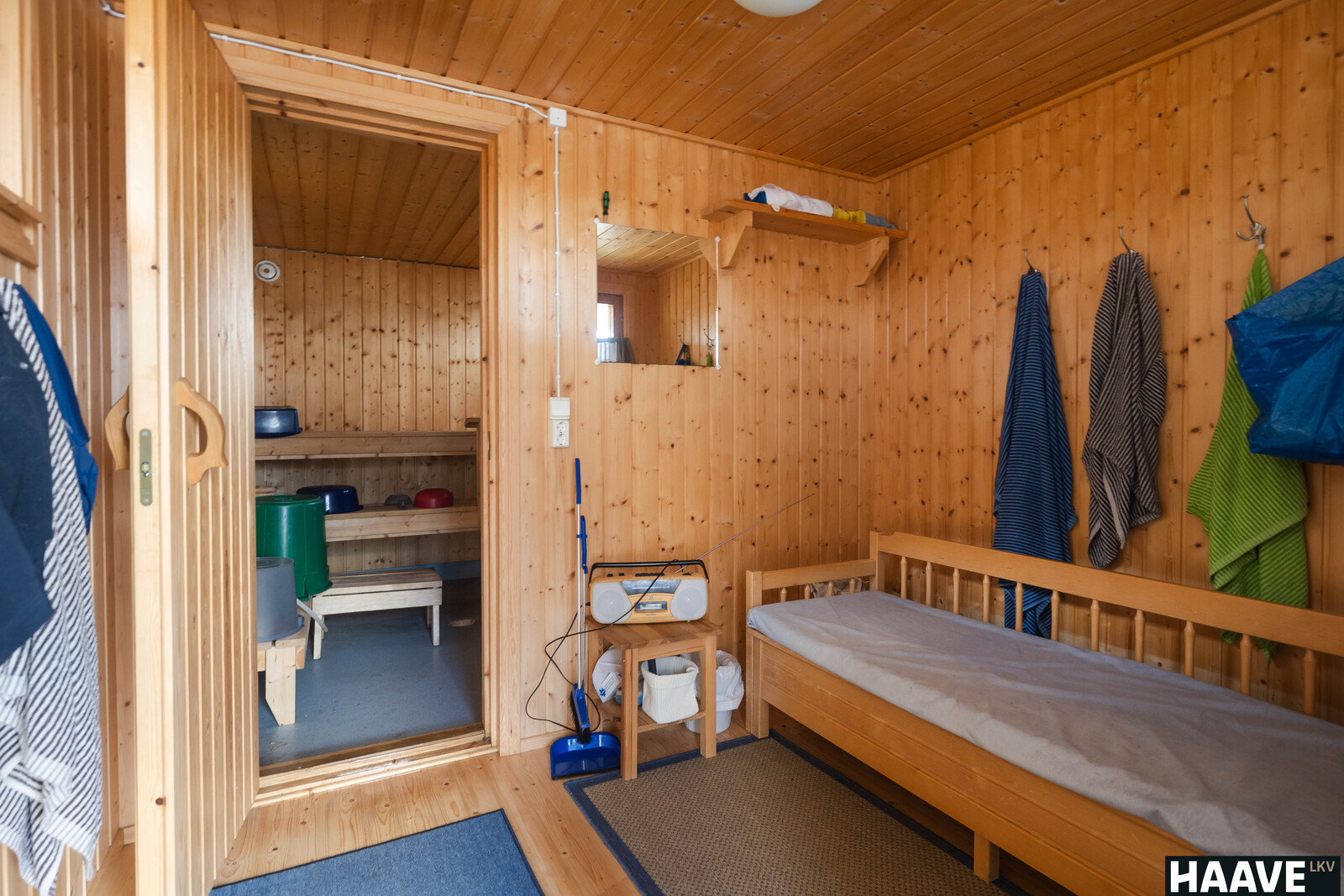 Erillinen saunarakennus, jossa tilava pukuhuone ja sauna, josta näkymät järvelle.