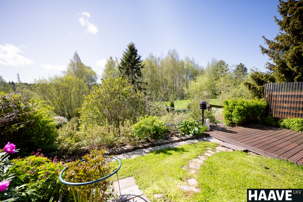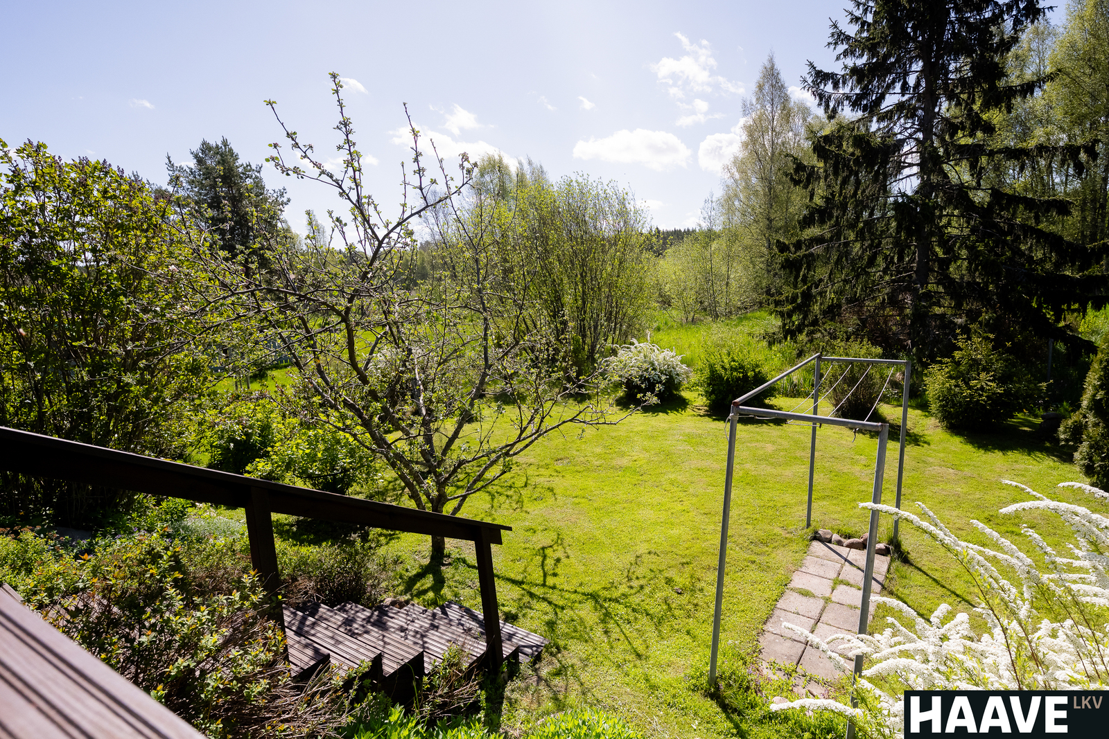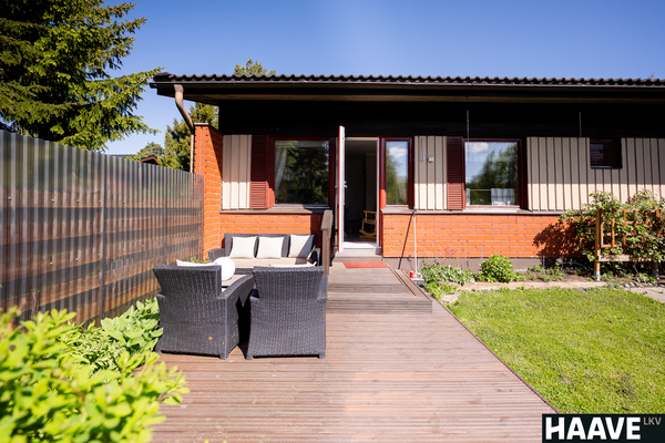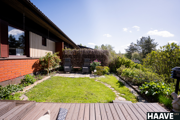 Suojaisella tilavalla takapihalla on terassi sekä marjapensaita että omenapuita.
