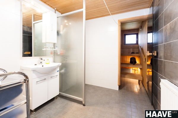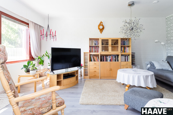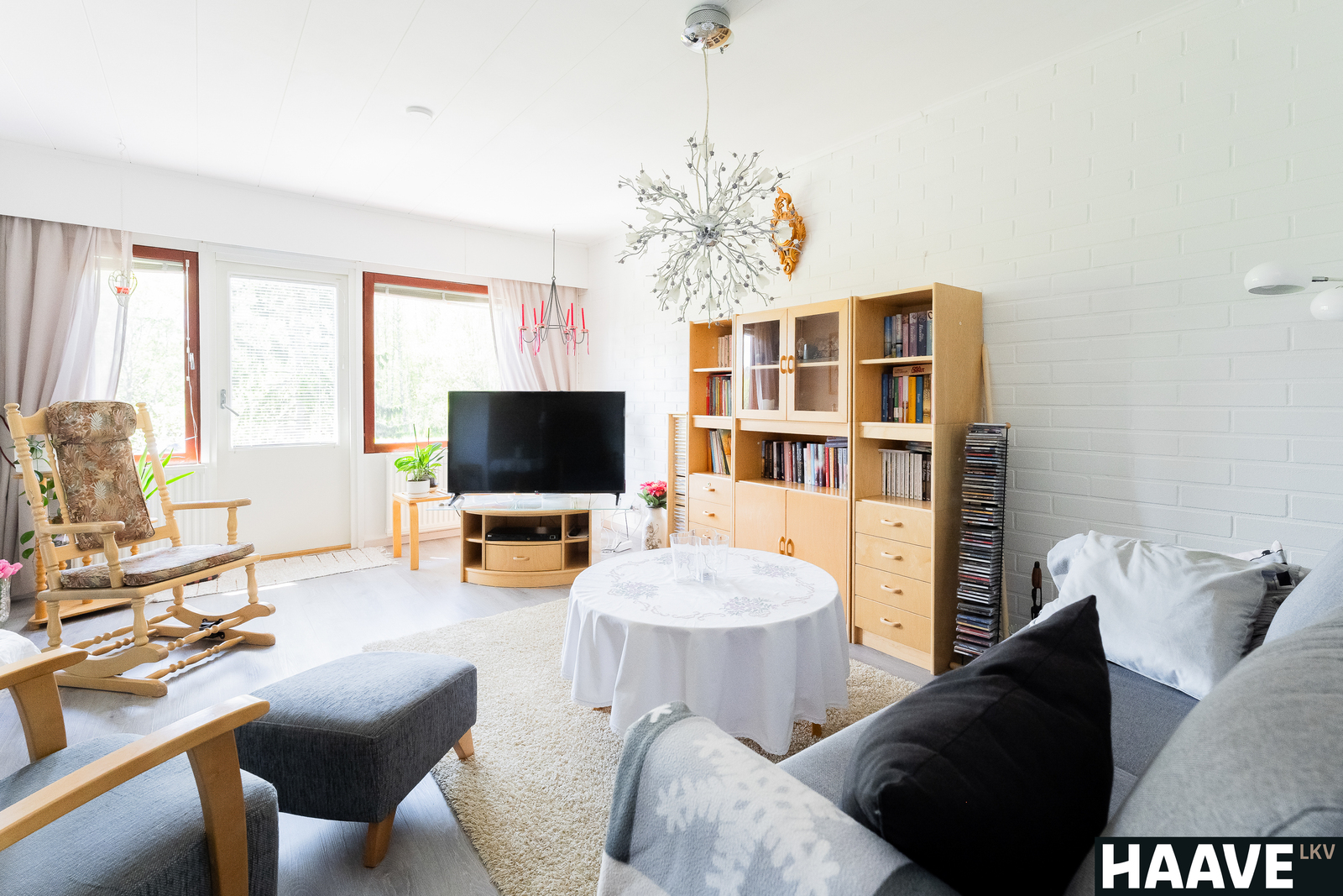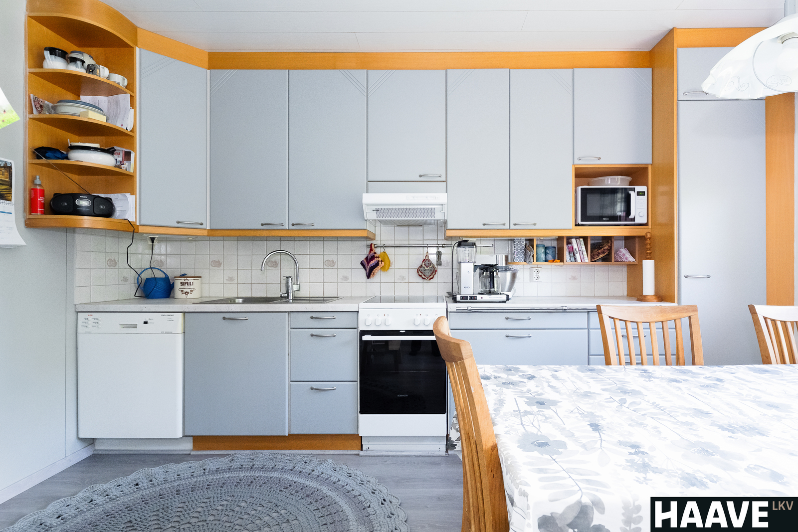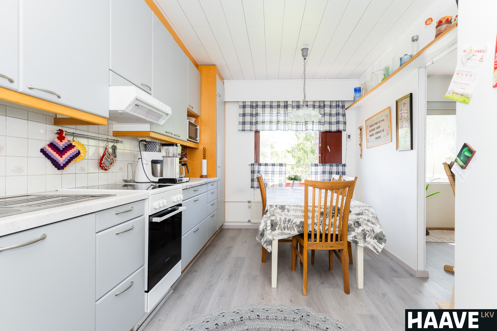 Rivitalon päätyasunto, jossa keittiö, olohuone, 2 makuuhuonetta, kylpyhuone, sauna, erillinen wc ja vaatehuone.