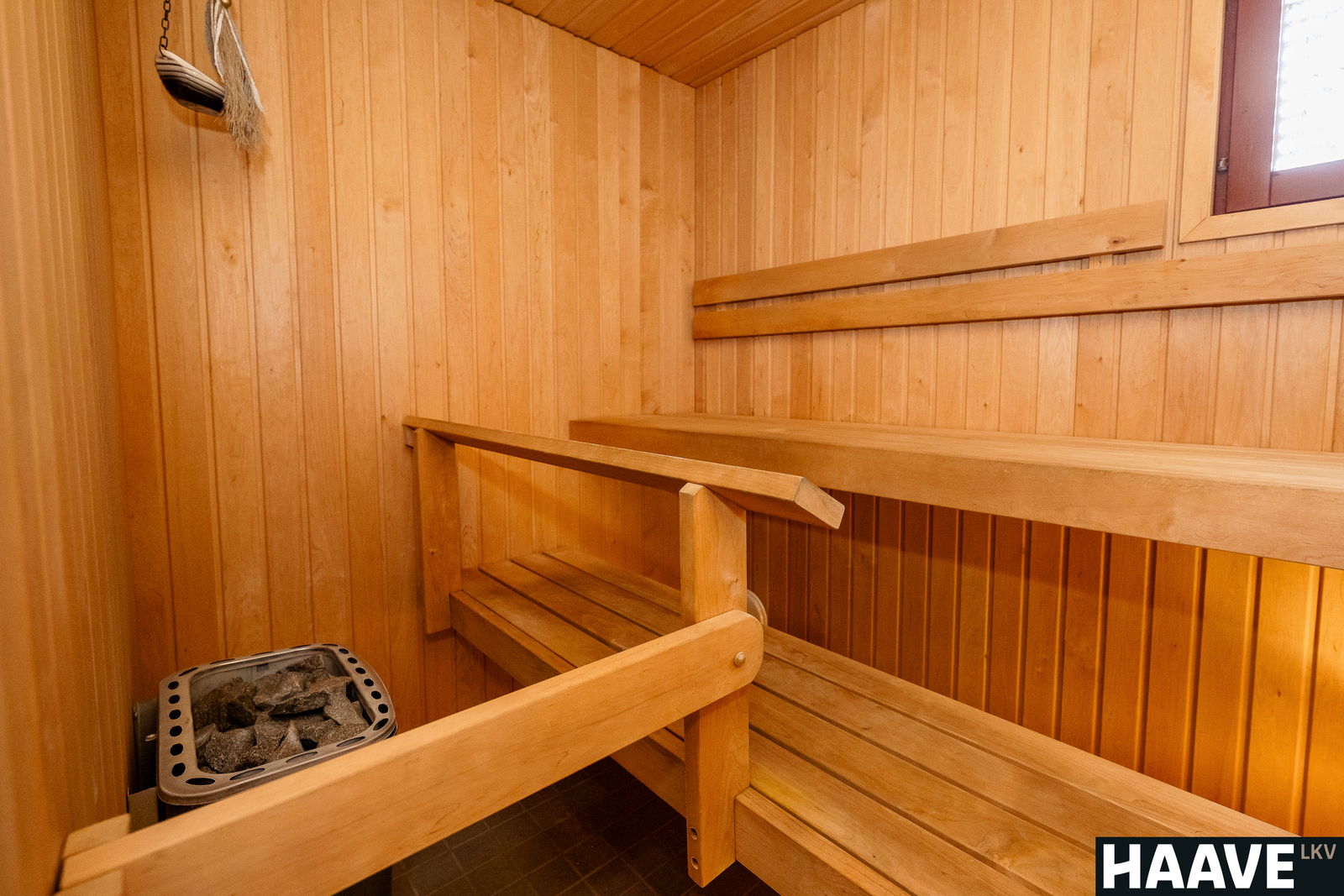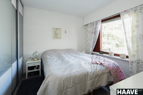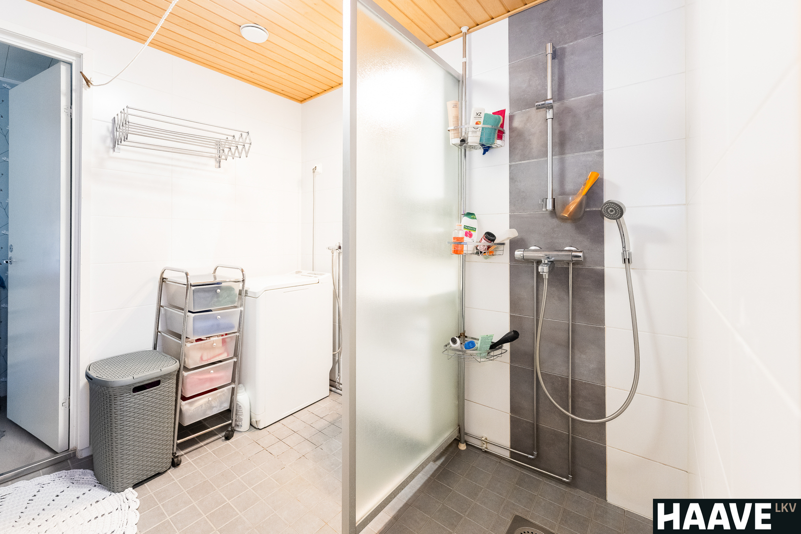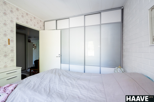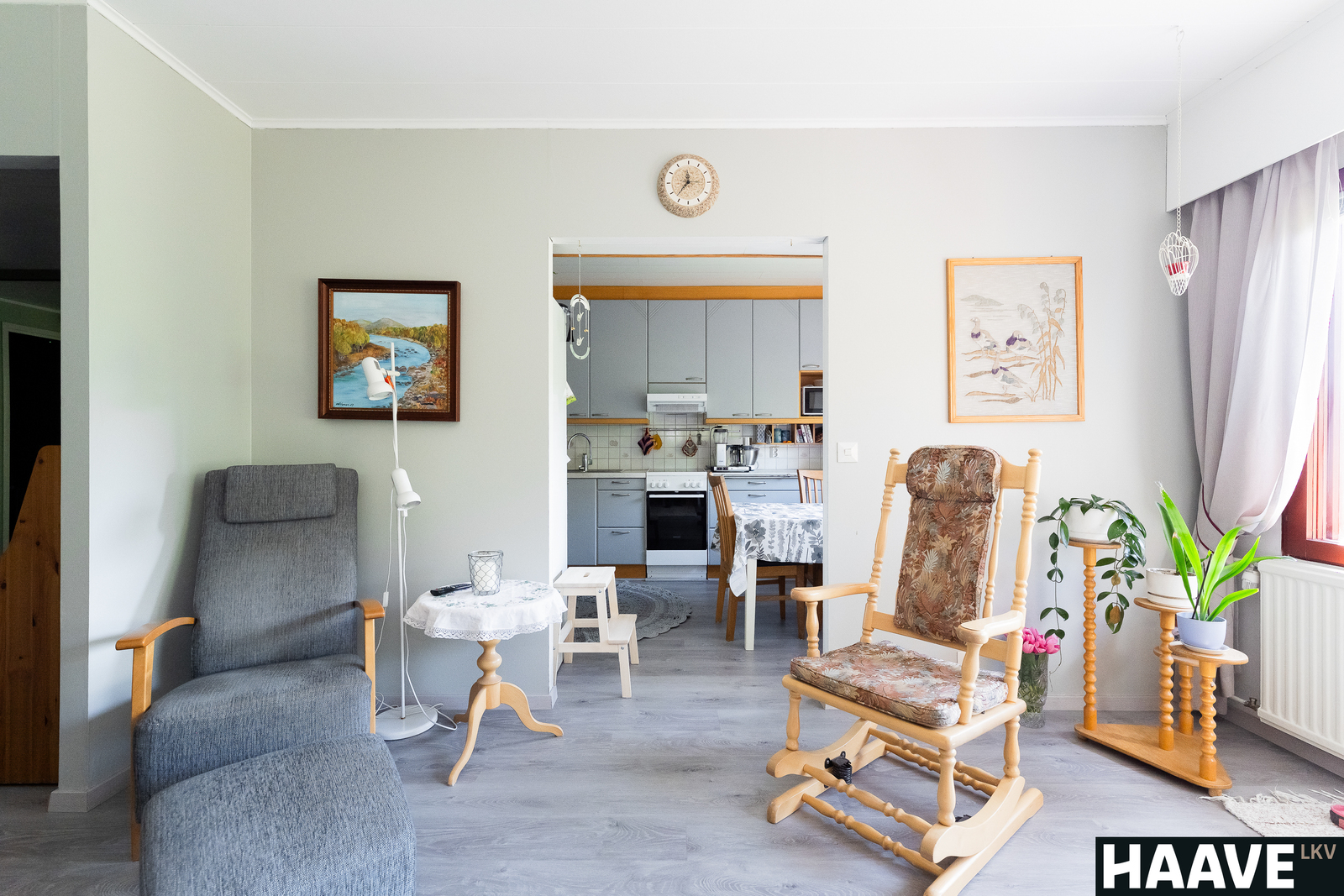 Rivitalon päätyasunto, jossa keittiö, olohuone, 2 makuuhuonetta, kylpyhuone, sauna, erillinen wc ja vaatehuone.