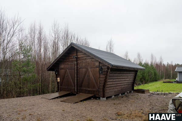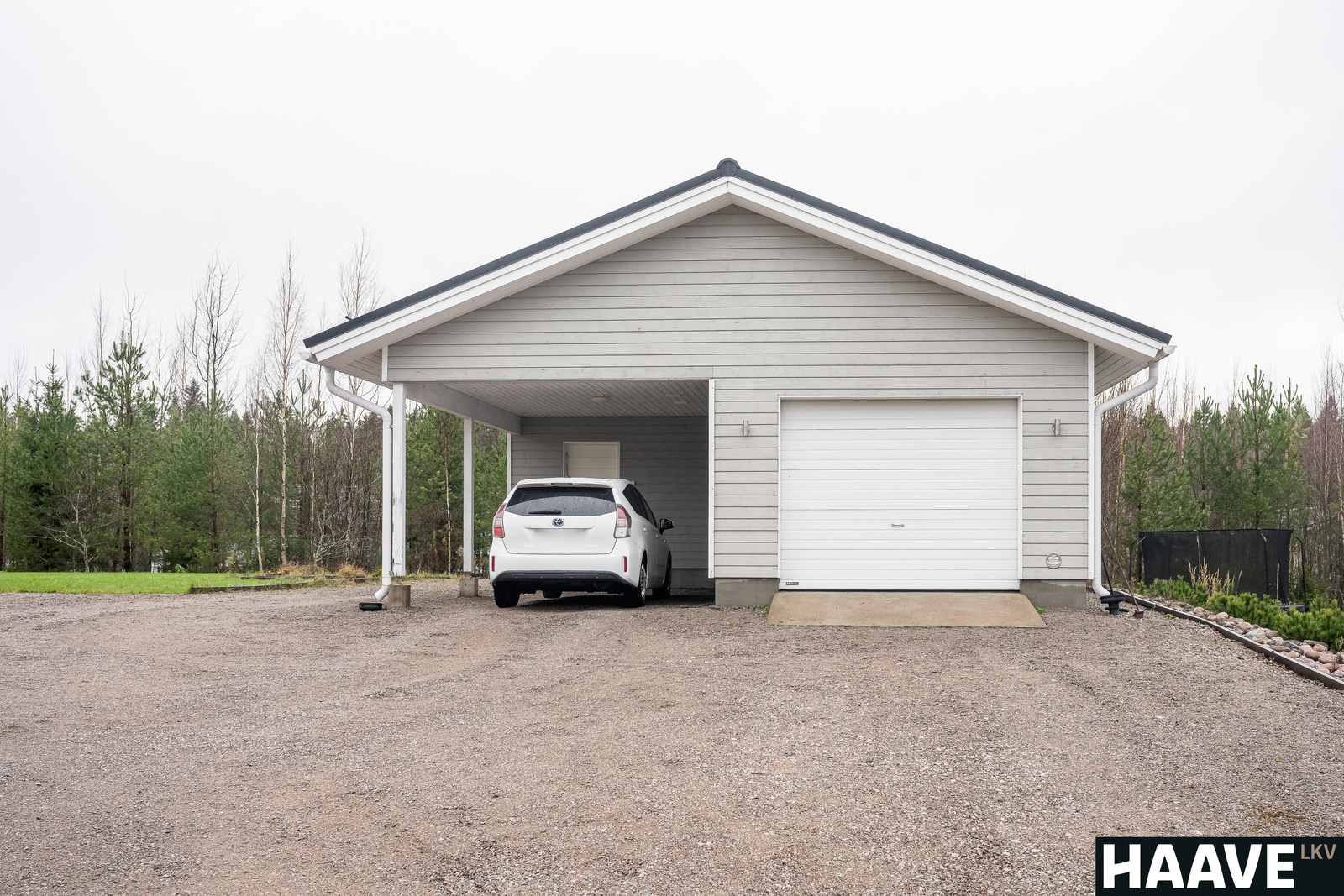 Talon vieressä on autotallirakennus, jonka katon alla myös autokatos. Sen takaa löytyy vaja vaikka polttopuiden säilytykseen.