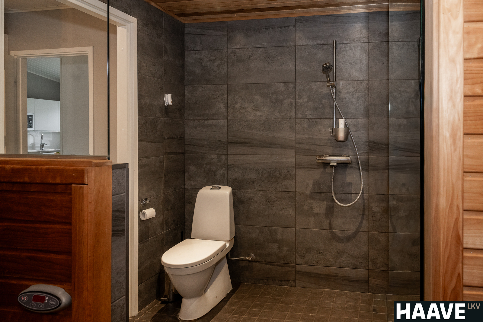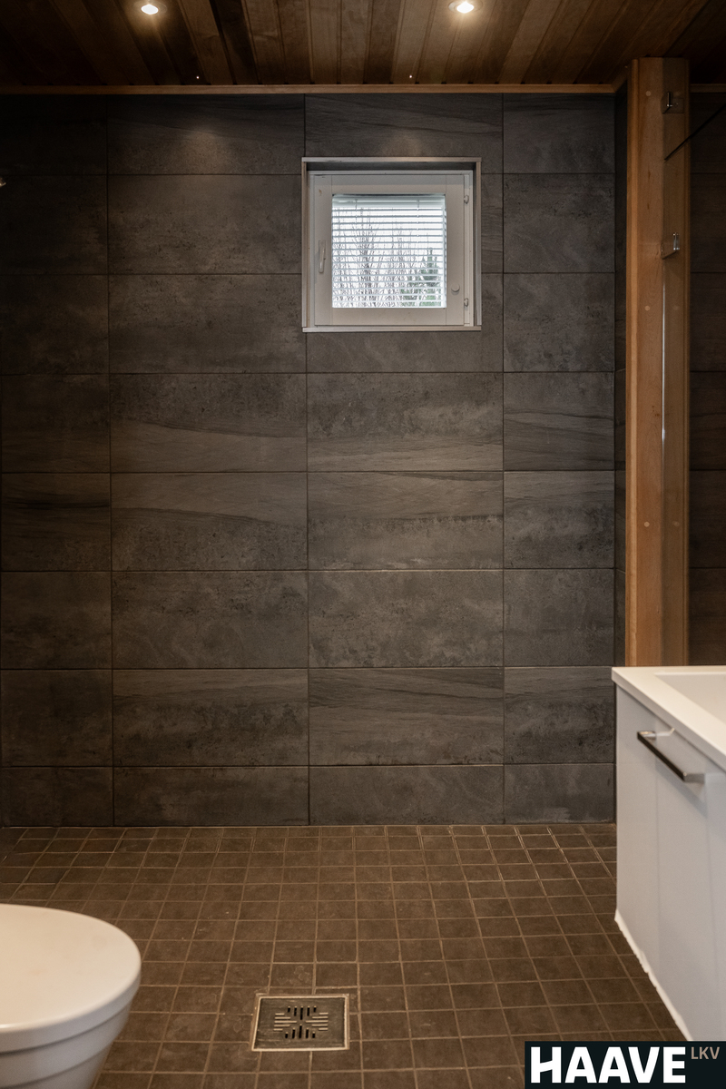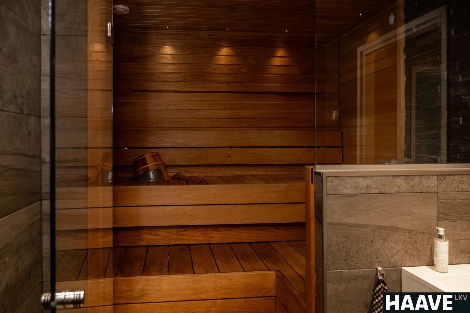 - Saunan kuvaus: Lasiseinä pesuhuoneeseen.