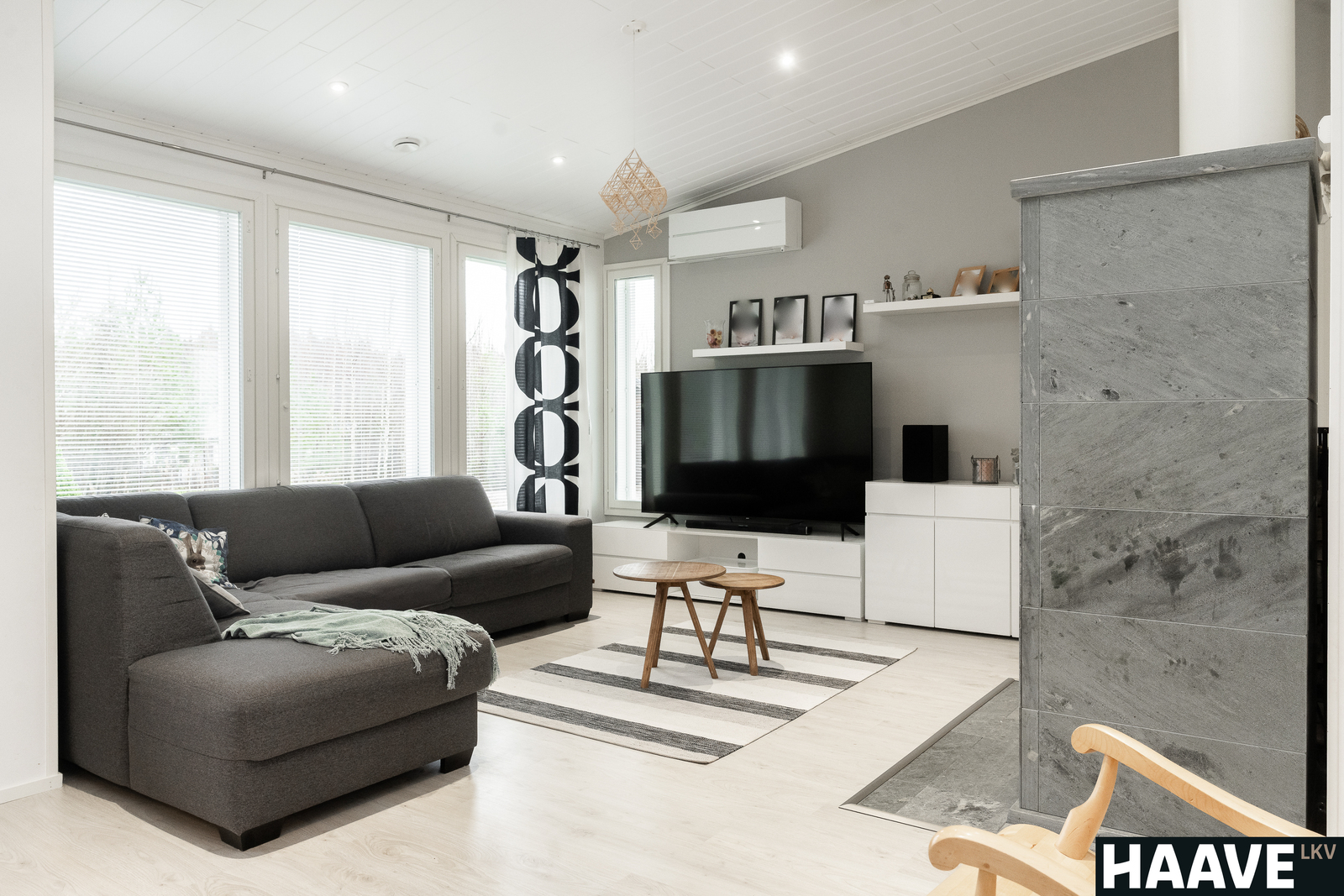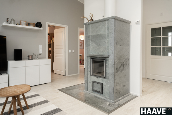 - Olohuoneen kuvaus: Takka ja ilmalämpöpumppu.