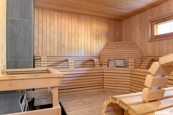 - Saunan kuvaus: Leppää seinissä, muotolauteet
